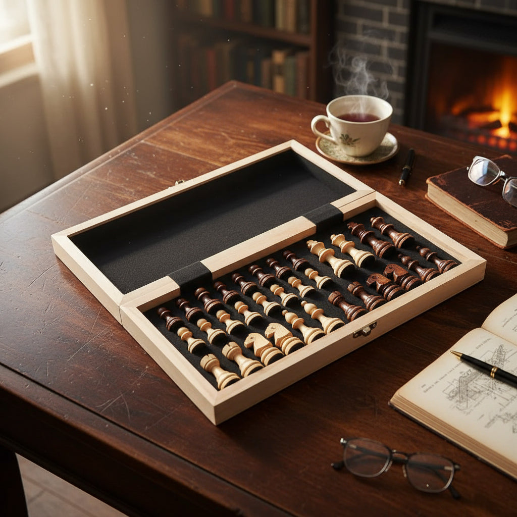 Destaca por su diseño plegable, la estabilidad de las piezas magnéticas y la calidad de la madera, siendo el tamaño ideal para uso profesional o de viaje.